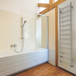 Square-profile taps with diamond-shaped upright and horizontal bars. Ideal for family bathrooms or utility rooms due to the multiple, wide-spaced gaps for hanging both towels and clothes. Has a gap of 63mm from the back of the bars up to the wall. Features 50mm pipe connections which can be matched to a 50mm H-block valve for a neat finish.
