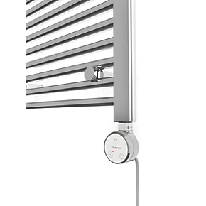Electric towel rail supplied with the Terma 43D element with a fixed operating temp of 43°C and a round clock-face-style head in matching silver. Element pre-programmed to run at internal temp of 43°C, for Low Surface Temp (LST) style operation. No timer. 2-hour drying function. Compatible with external timer, as remembers settings when off. Features 2 buttons for power and drying functions. Supplied with element pre-fitted on right-hand side. Rail is flat, so can be flipped to have element on left. Simply rotate head to face forward again. Silver with grey cable. Trades can wire this in within minutes, no commissioning or lengthy instructions.