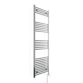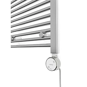 Electric towel rail supplied with the Terma MOA Blue element, smartphone controlled, fully thermostatic and a round clock-face-style head in matching silver. Full operational control on smartphone / tablet via Bluetooth, with a choice of internal temp (30 to 60°C) or ambient room temp (15 to 30°C) regulation. 7-day timer. 2-hour drying function. Features power button, but all other controls are made via app. Supplied with element pre-fitted on right-hand side. Rail is flat, so can be flipped to have element on left. Simply rotate head to face forward again. The Terma BlueLine app is available for iOS and Android. Silver with grey cable. Trades can wire this in within minutes, no commissioning or lengthy instructions.
