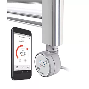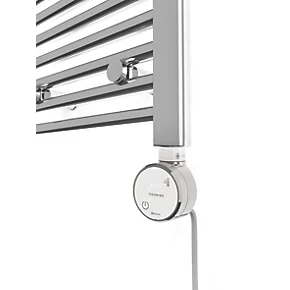 Electric towel rail supplied with the Terma MOA Blue element, smartphone controlled, fully thermostatic and with round clock-face-style head in matching silver. Full operational control on smartphone / tablet via Bluetooth, with a choice of internal temperature (30 to 60°C) or ambient room temperature (15 to 30°C) regulation. 7-day timer. 2-hour drying function. Features power button, but all other controls are made via app. Supplied with element pre-fitted on right-hand side. Rail is flat, so can be flipped to have element on left. Simply rotate head to face forward again. The Terma BlueLine app is available for iOS and Android. Silver with grey cable. Trades can wire this in within minutes, no commissioning or lengthy instructions.