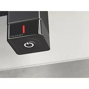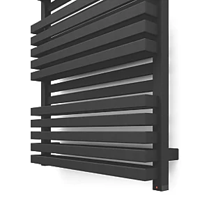 Textured shimmered black, oil-filled, electric towel rail. Double-layered for extra heat output and supplied with the internalised Terma ONE Element. Can be channelled away into the wall, or neatly routed down the wall. 2 x heat settings, 45 and 60°C, regulating the internal radiator temperature, denoted by a multi-colour LED. Features a 2hr drying function. Compatible with external timer as remembers settings when off. IR receiver makes this compatible with the Terma TTIR Infrared Controller (available separately), providing full 7-day timer functionality. Also features a discreet underside control button and miniature front-facing LED panel pre-fitted to the right hand side. Note: this cannot be moved to the left hand side.