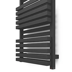 Textured shimmered black, oil-filled, electric towel rail. Double-layered for extra heat output and supplied with the internalised Terma ONE Element. Can be channelled away into the wall, or neatly routed down the wall. 2 x heat settings, 45 and 60°C, regulating the internal radiator temperature, denoted by a multi-colour LED. Features a 2hr drying function. Compatible with external timer as remembers settings when off. IR receiver makes this compatible with the Terma TTIR Infrared Controller (available separately), providing full 7-day timer functionality. Also features a discreet underside control button and miniature front-facing LED panel pre-fitted to the right hand side. Note: this cannot be moved to the left hand side.