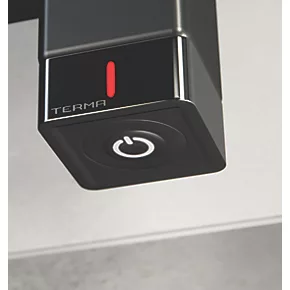 Electric towel rail with minimalist internal Terma One heating element and square profile bars. The cable runs out through the bottom right mounting bracket so it can be channelled away into the wall or neatly routed down the wall. Features 2 heat settings (45°C and 60°C), a 2-hour drying function and miniature front-facing LED panel pre-fitted to the right-hand side (Note: This cannot be moved to the left-hand side). Can be used with an external timer as settings are stored when off. Compatible with the Terma TTIR Infrared Controller (not supplied). Rough-textured matt finish. Supplied with matching black cable.