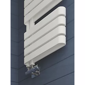 Designed with large flat bars which sweep forward and then bend backwards on themselves to create a towel rail which is only mounted to the wall on one side, leaving the other side open and free for easily hanging towels on. Can be mounted either way up as it has symmerical bars top and bottom. Large surface area for a higher heat output. Can also be fitted as dual fuel. Requires a Terma heating element and the Terma Integrated Valve with Immersion Tube (no T-piece required) to easily install as dual fuel.